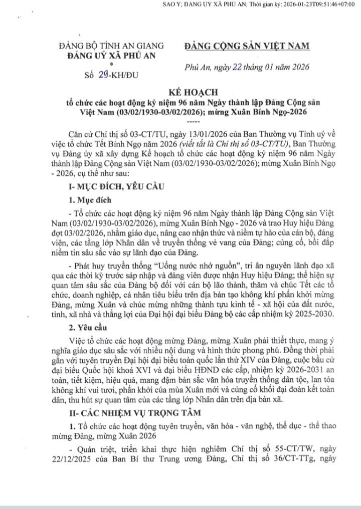 Nhân dịp kỷ niệm 96 năm Ngày thành lập Đảng Cộng sản Việt Nam (3/2/1930 - 3/2/2026). Ngày 27/1, Ban Thường vụ Đảng ủy xã Phú An tổ chức Lễ trao tặng huy hiệu Đảng đợt 03/02/2026.