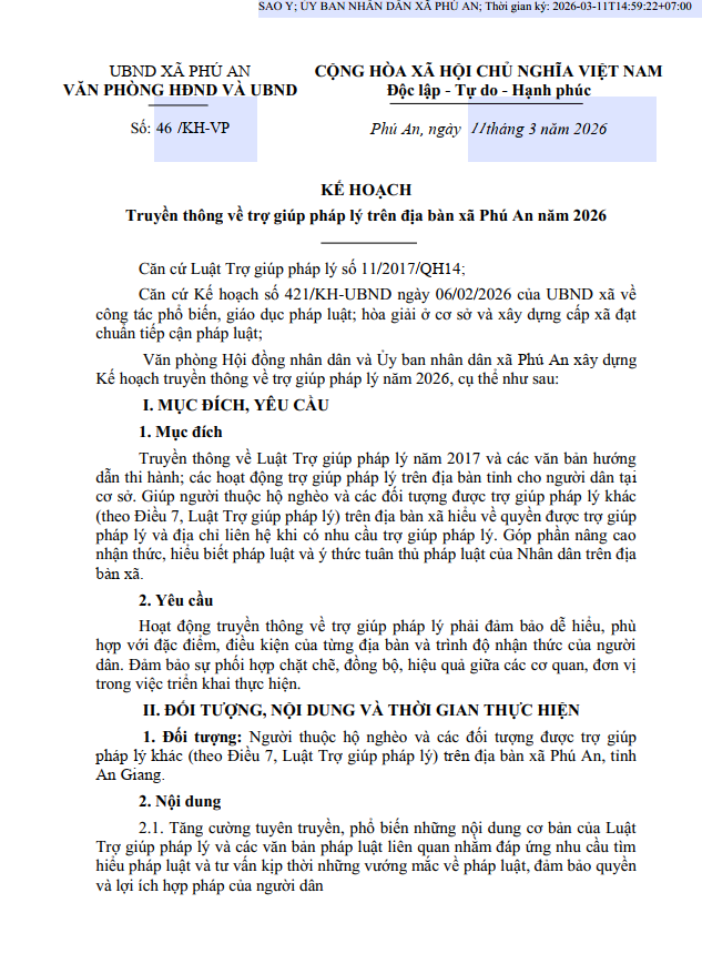 Kế hoạch truyền thông về trợ giúp pháp lý trên địa bàn xã Phú An năm 2026