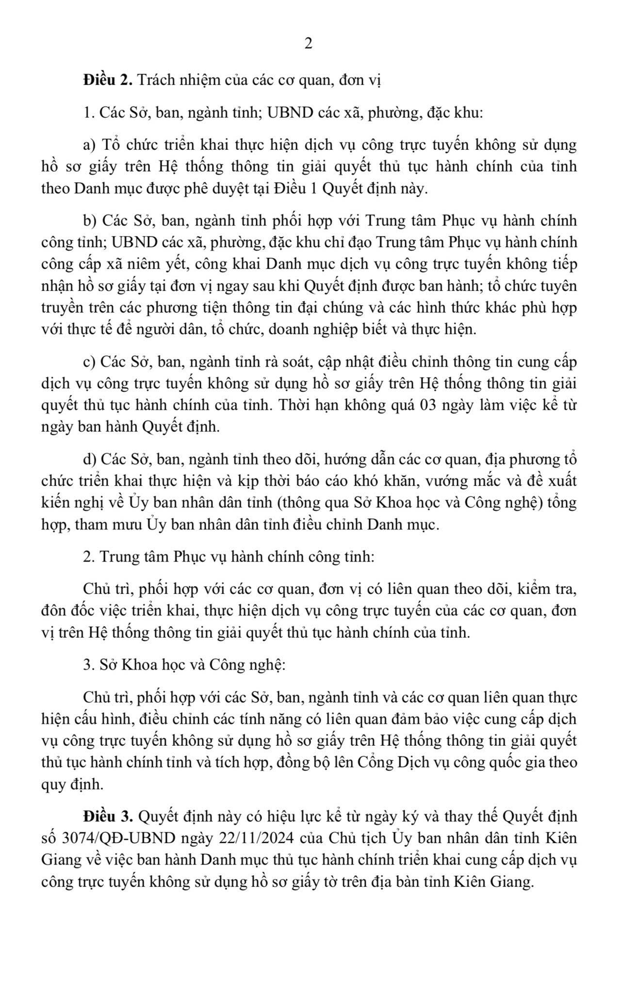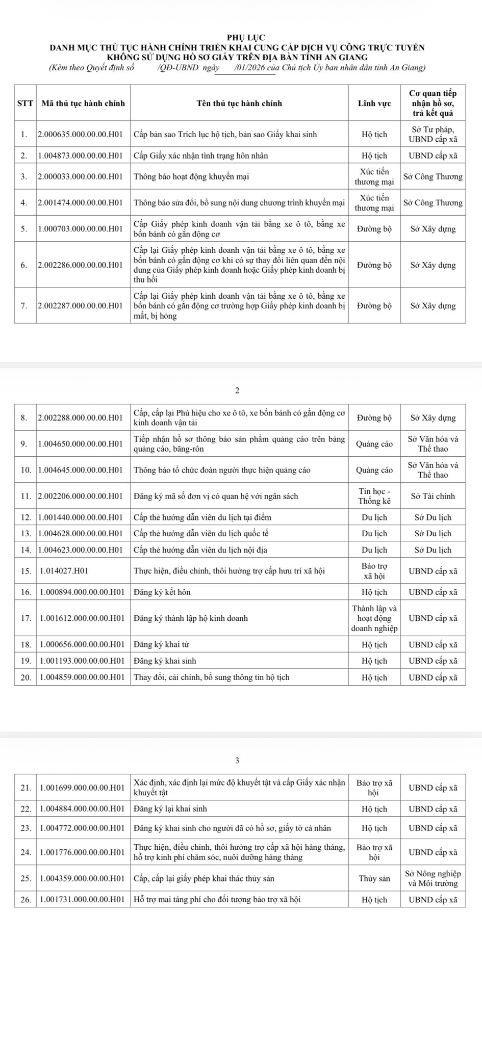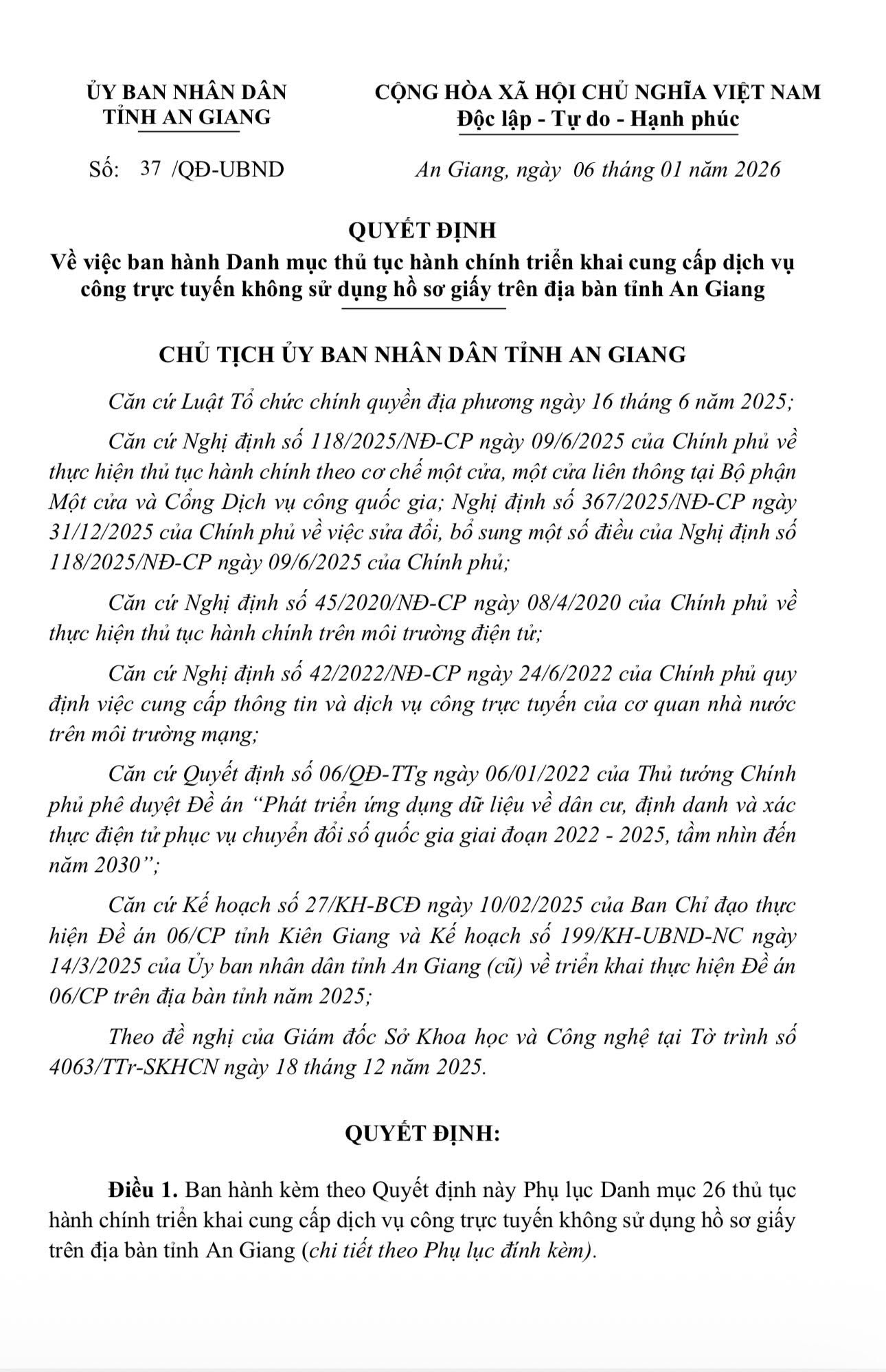 UBND tỉnh An Giang đã ban hành Quyết định số 37/QĐ-UBND ngày 06/01/2026 về Danh mục 26 thủ tục hành chính triển khai cung cấp dịch vụ công trực tuyến không sử dụng hồ sơ giấy trên địa bàn tỉnh.